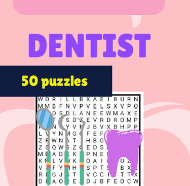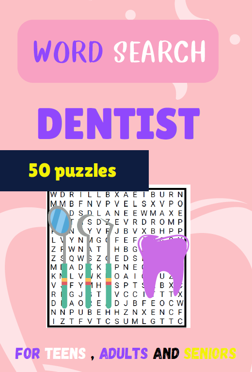 word search puzzle about dental , dentists , teeth , cavity for dentists professions , teens , adults, and seniors | 6 inch x 9 inch | 50 Puzzles