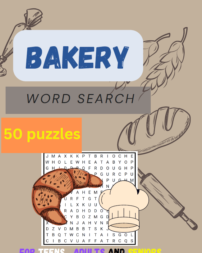 word search puzzle about baking , cake , frostings , muffins for baker professions , teens , adults, and seniors | 8.5 inch x 11 inch | 50 Puzzles